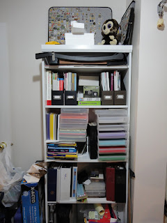 Every crafter loves to have THE craftroom. I have always dreamed to have THE craftroom since I started getting involved in crafting. Richard, my fiance, finally got me started on MY craftroom! He pulled out all my bookshelves filled with books...my other love...reading. He put in a large gorgeous white table...purchased CHEAP CHEAP from craigslist. He got me cube units from Michaels which he then mounted on the wall over the table. He even installed little pot lights for added lighting to work with. And recently, he got me a shelving unit for additional storage area.